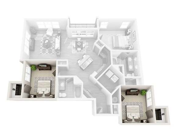 2. Shared Bathroom: In this floor plan, the two bathrooms are shared between the three bedrooms. Typically, one bathroom serves both the residents of two bedrooms, while the second bathroom is shared by the third bedroom. The bathrooms are centrally located for easy access, and are designed to be functional and convenient for multiple people using them.